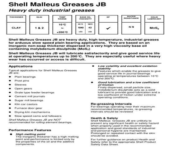 Shell Malleus JB2是高溫極壓合成潤滑脂,由超高粘度基礎油加無機稠化劑和MoS2固體潤滑劑合成的。殼牌馬力士JB(S7222)是一個沉重的責任,溫度高,工業潤滑脂