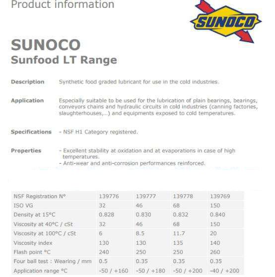 合成潤滑油品種用于冷凍食品機械。尤其適合普通潤滑軸承和液壓系統回路罐頭廠、屠宰場等)和設備、低溫暴露。