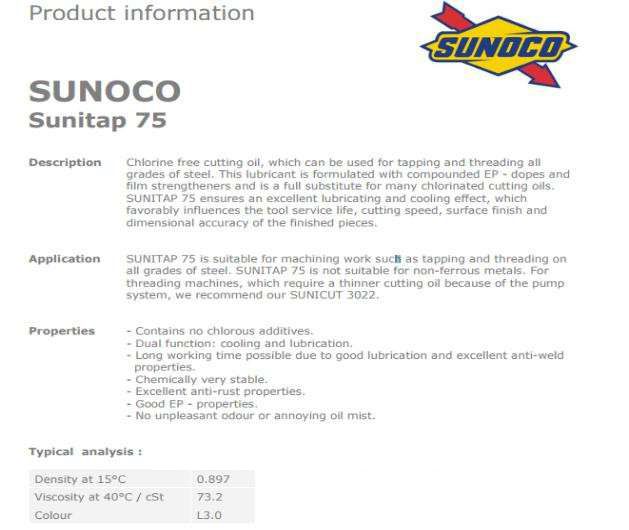可用于各種鋼的各種牌號的攻牙和螺紋加工。sunitap 75不適合有色金屬。穿線機,需要更薄的切削油,因為泵系統,