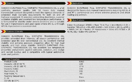 SUNOCO DURATRANS FULL全合成變速箱油是專為重型手動變速箱要求API GL-4和MT-1性能和在極端的壓力和沖擊負荷是常見的。