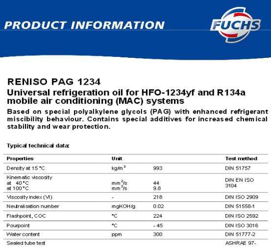 福斯RENISO PAG 1234 聚亞烷基二醇(PAG)冷凍機油