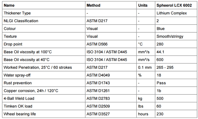 spheerol LCX 6002是一個超級復合鋰基潤滑脂NLGI 2一致的。它采用了一個獨特的組合