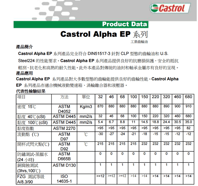 Castrol Alpha EP系列產品完全符合DIN51517-3針對CLP型態的齒輪油和U.S.