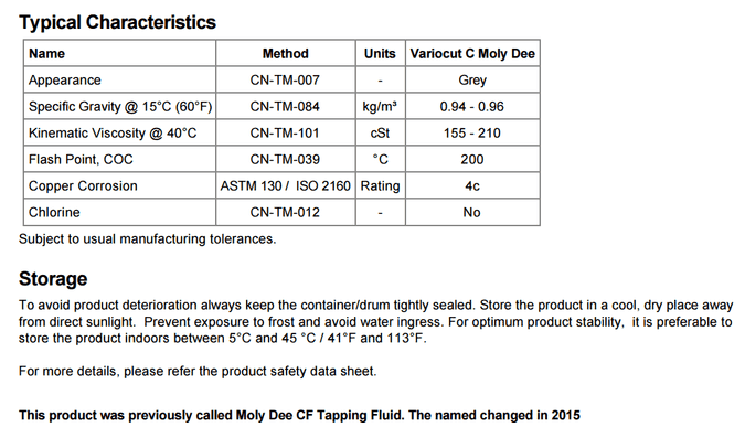 嘉實多Variocut C Moly Dee(以前稱為called Moly Dee CF Tapping Fluid)是一種高性能的攻絲液