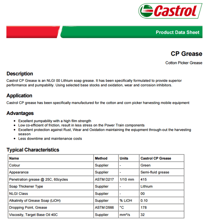 嘉實多CP潤滑脂是專門制造的棉花和玉米收割機收割的移動設備